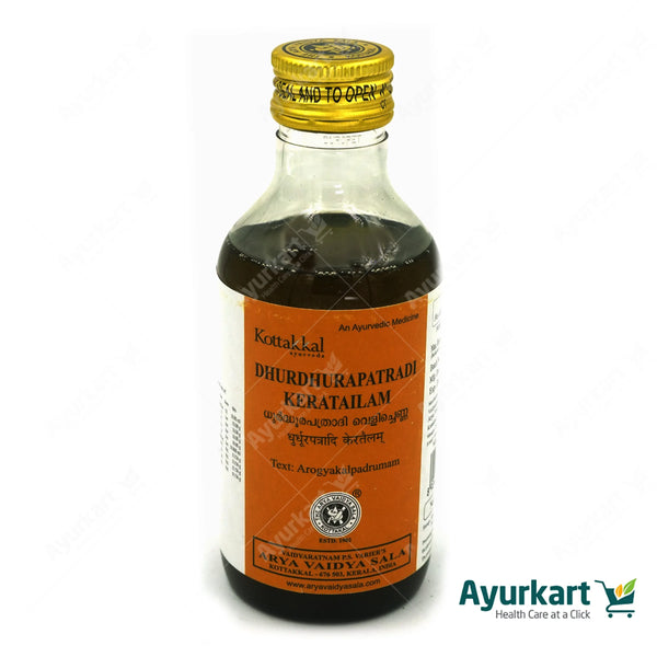 Dhurdhurapatradi Kera Tailam is a traditional Ayurvedic hair oil manufactured by Kottakkal Arya Vaidya Sala, a renowned Ayurvedic brand known for its commitment to quality and adherence to Ayurvedic principles. It is a specialized oil formulated to promote hair growth, strengthen the scalp, and prevent hair loss.
