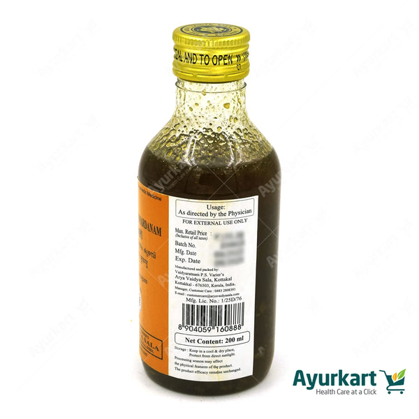 USAGE: Apply body oil liberally on the affected part or whole body and massage gently for 30 minutes to one hour before bath. Oils for hair can be applied on head 30 minutes before bath or as directed by the Physician.