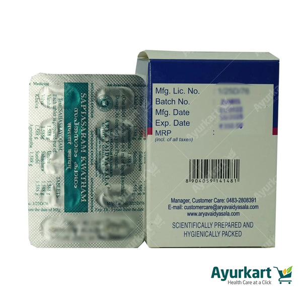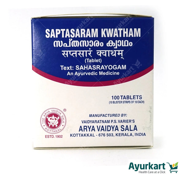 Saptasaram Kwatham Tablets from Kottakkal are a renowned Ayurvedic formulation designed to address various digestive and circulatory issues. These tablets, available in a pack of 100, are based on a traditional recipe that utilizes seven potent herbs known for their therapeutic effects on the digestive system and overall body health.