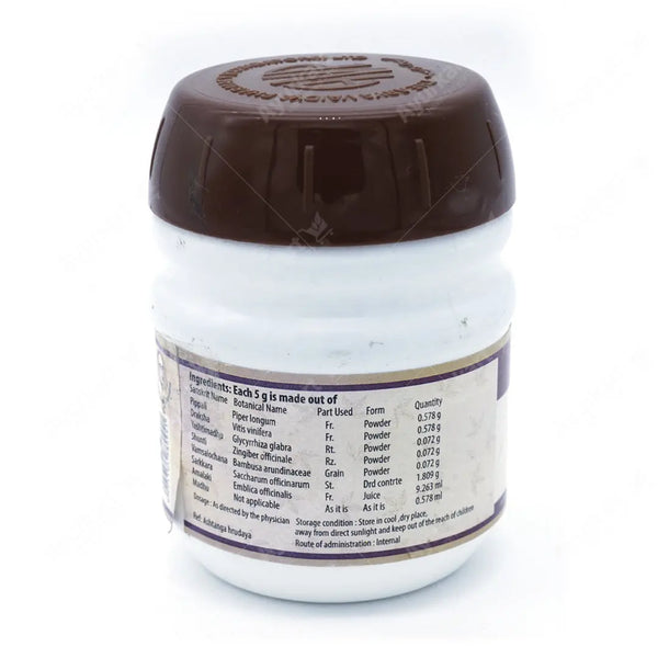 - Usual dose is – 5 – 10 grams before or after food along with water or as directed by Ayurvedic doctor.