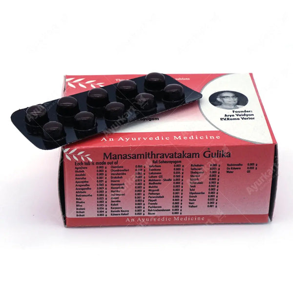 Manasamitra Vatakam is a tablet, used in Ayurvedic treatment of psychiatric conditions, to improve intelligence, speech problems, etc. It is prepared from a combination of 73 ingredients. This medicine should only be taken under strict medical supervision. This medicine is formulated based on Kerala Ayurveda principles.